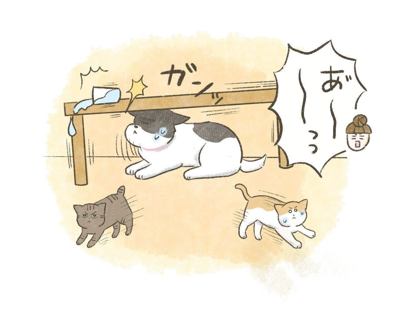 テーブルに勢いよく頭をぶつけ、上に置いていたコップは倒れるは、一緒に眠っていた猫たちも驚いてかけ回るという事件が起きました。