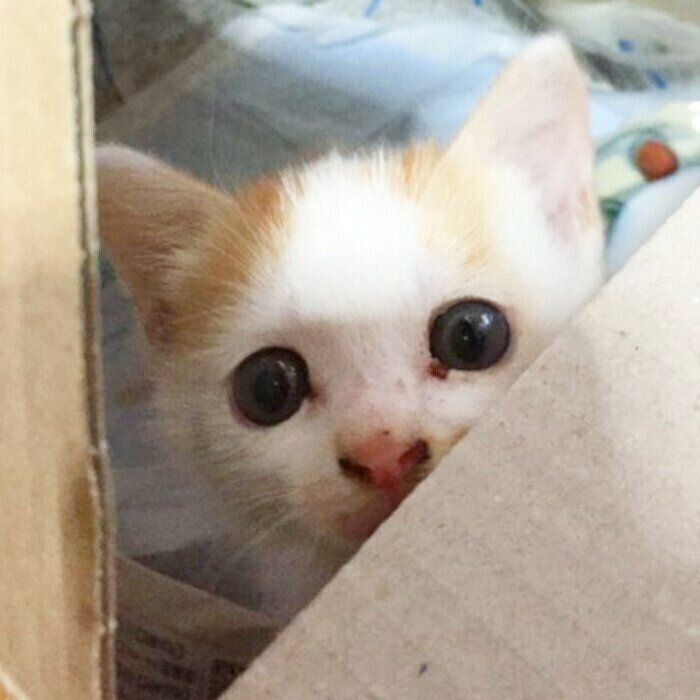 この写真は保護して間もない頃に撮影したもので、当時はまだケージを用意していなかったため、簡易のダンボールハウスで過ごしていたといいます。