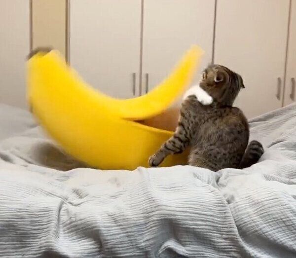 「バナナの中で世界一幸せそうに寝てる」と投稿されたこちらの動画には、飼い主さんがバナナ型猫ベッドをオープンすると、気持ち良さそうに眠るまつたけちゃんの姿が映っていました。