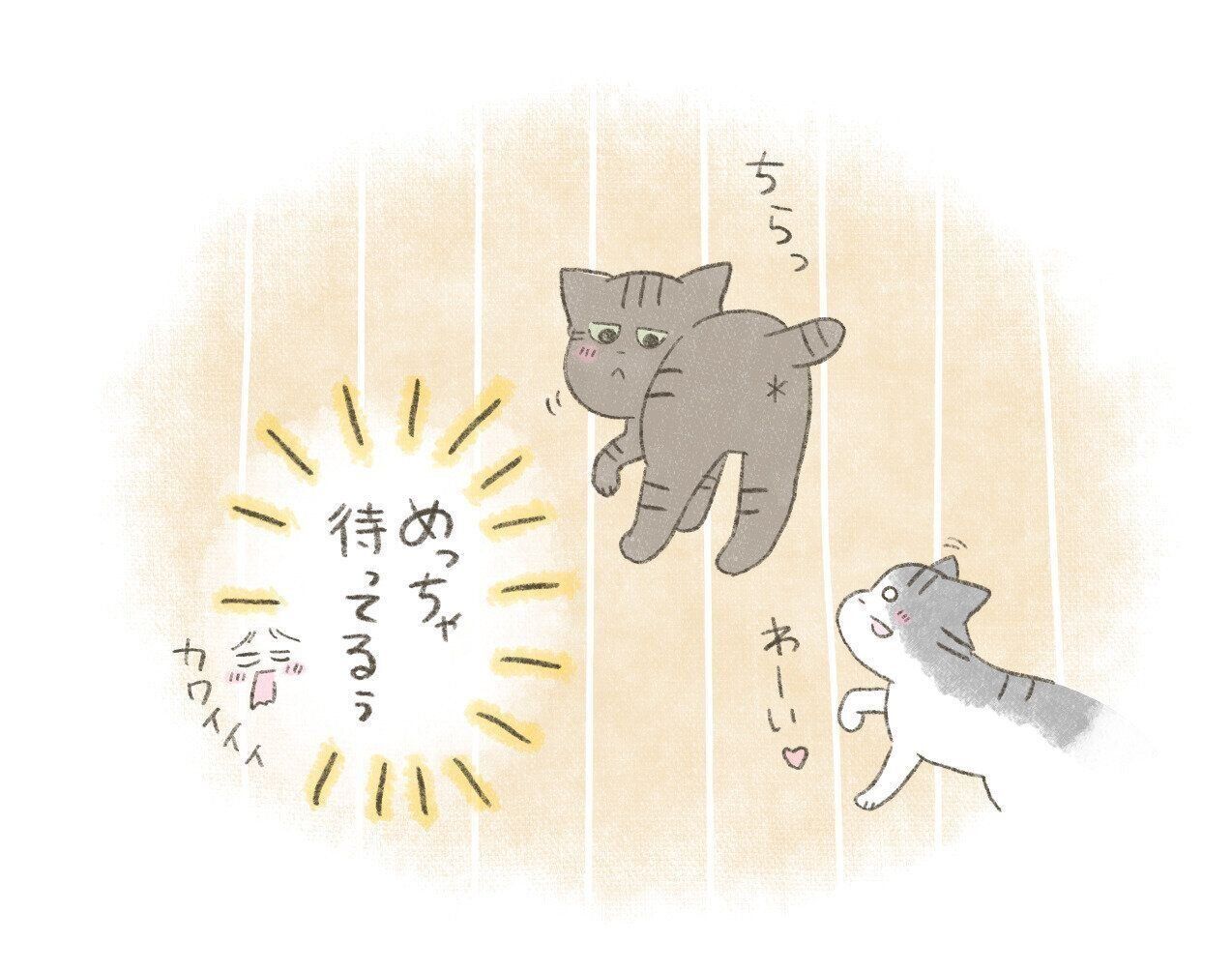 後を追いかけてくるこいちゃんを待つように、ちょっとウキウキして満更でもなさそうなたまちゃん。