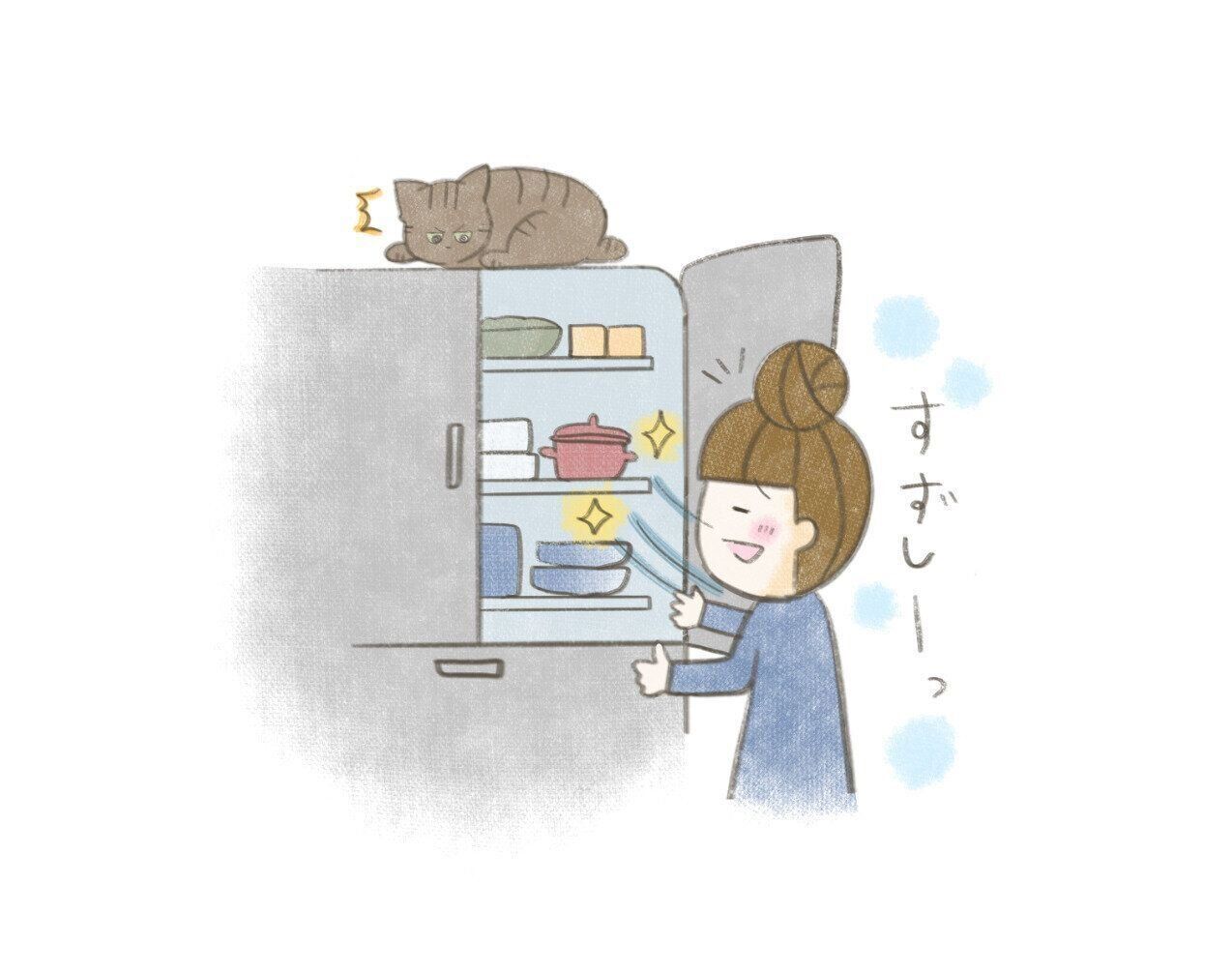 我が家ではよく見かける光景ですが、猫って冬でも夏でも冷蔵庫の上に陣取りませんか?