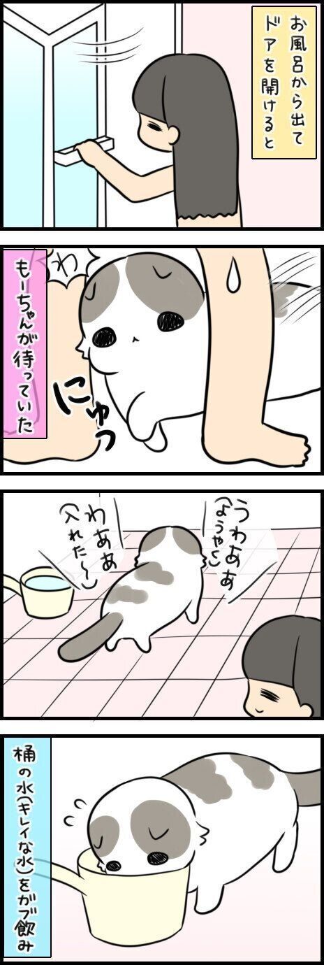 お風呂場に来ない日はないし、足や頭を濡らしてお風呂場から出てくるけど、気にしてない様子ですね。