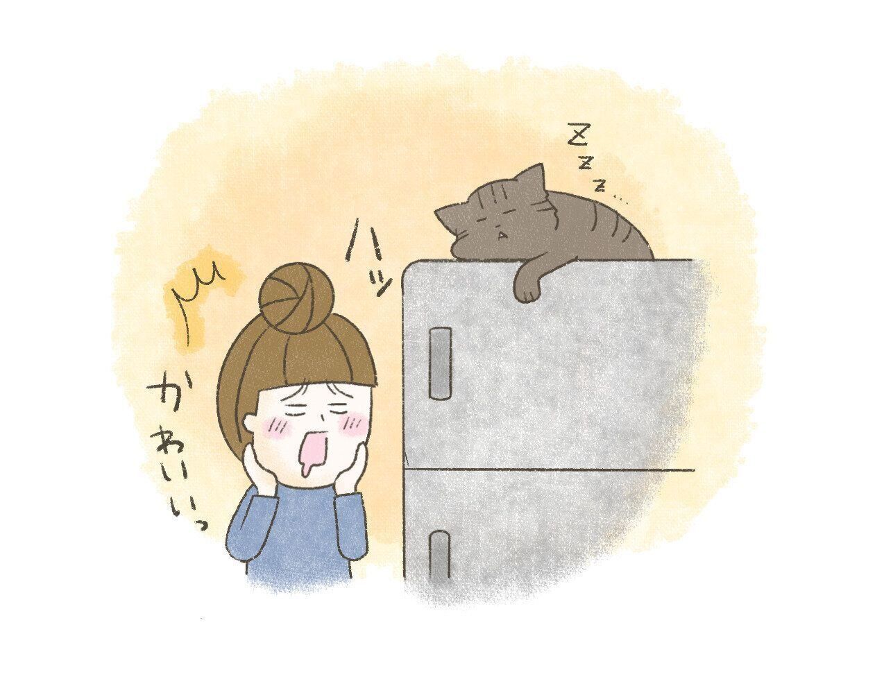 冷蔵庫を前にふっと目線を上げると、まるで液体かのように幸せな顔で眠るたまちゃん。