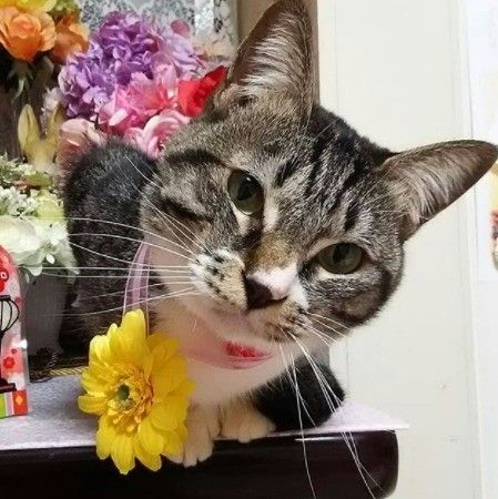 こちらは、ガーベラの花で作った金メダル。素晴らしいアイデアですよね!逃げ足がとても早いニャンコなのだそうですよ。短距離走で活躍してくれるかも?