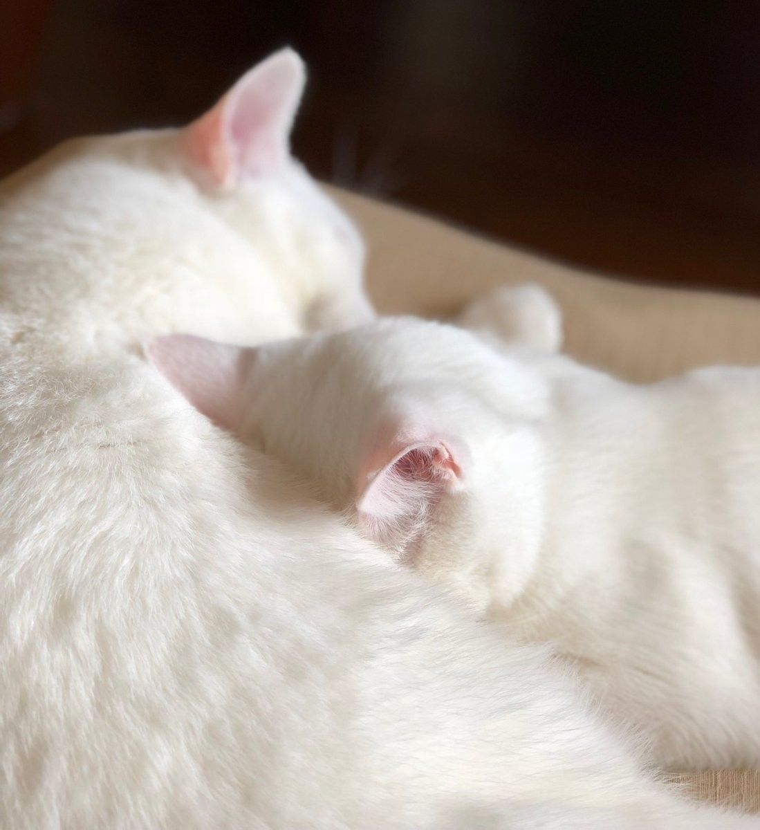 ジンくんとラムちゃんが仲良くお昼寝。くっついて寝ている兄と妹、本当に可愛らしいですね。妹のラムちゃんは、先天性の聴覚障害で耳が聞こえないのだそうです。もし野良猫として生きていかなければならなかったら…考えただけでも、辛い気持ちになりますね。