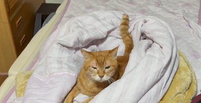 弟猫と幸せそうに眠る「四男坊」 布団をかぶって添い寝する猫と赤ちゃんに7万人夢中