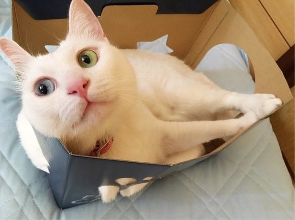 オッドアイとは、全身の被毛が白色の猫や白い毛が入った毛柄に多く、左右の目の色が異なる状態。片方の目は必ずブルーになり、もう片方の目はグリーンやイエローなど違う色になります。