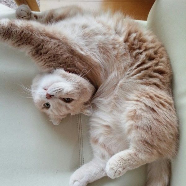 メスのスコティッシュフォールドの猫ちゃん。お顔の表情まではっきりと分かるダイナミックなのび~ポーズを披露してくれています。見ているほうも気持ちよくなってしまいそうな写真ですね。決定的な瞬間がしっかりと切り取られています。
