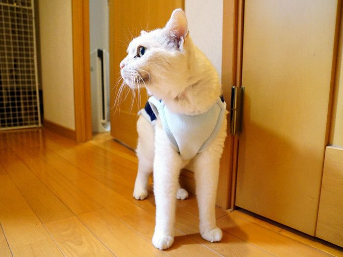 あまりにも不憫だったのでカラーをやめ、術後服にしてみたところ、ようやくふつうに動けるようになったという(;・ω・A
