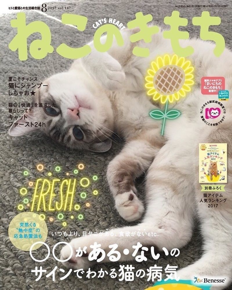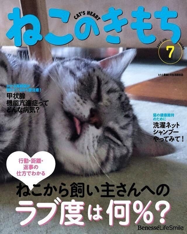 ごろ~んとあおむけになって見事なヘソ天を披露しているのは、@meg_melthecatさんのおうちのメルちゃん。こんな表紙だったら、見ているだけで思わず撫でたくなってしまいますよね。