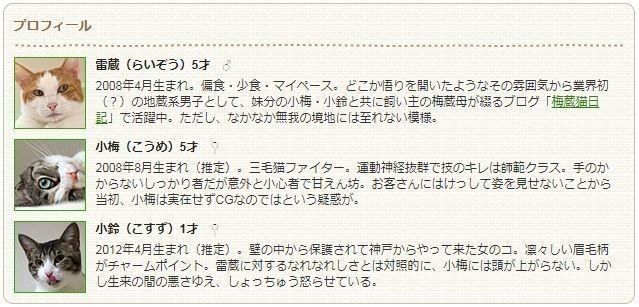 それぞれ好き勝手に自己紹介している梅蔵家の面々ですが、どんな性格のコか伝わりましたか? じつは、3猫の間には不思議な三角関係があるのです。これはまた、別の機会に……。
