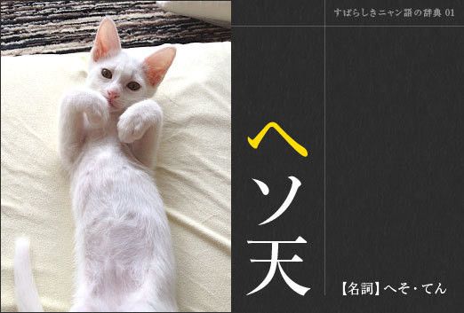 猫があおむけになり、「おへそを天井に向ける」状態の略称。ソファーなどの物陰やキャットタワーの上で見られることが多い。