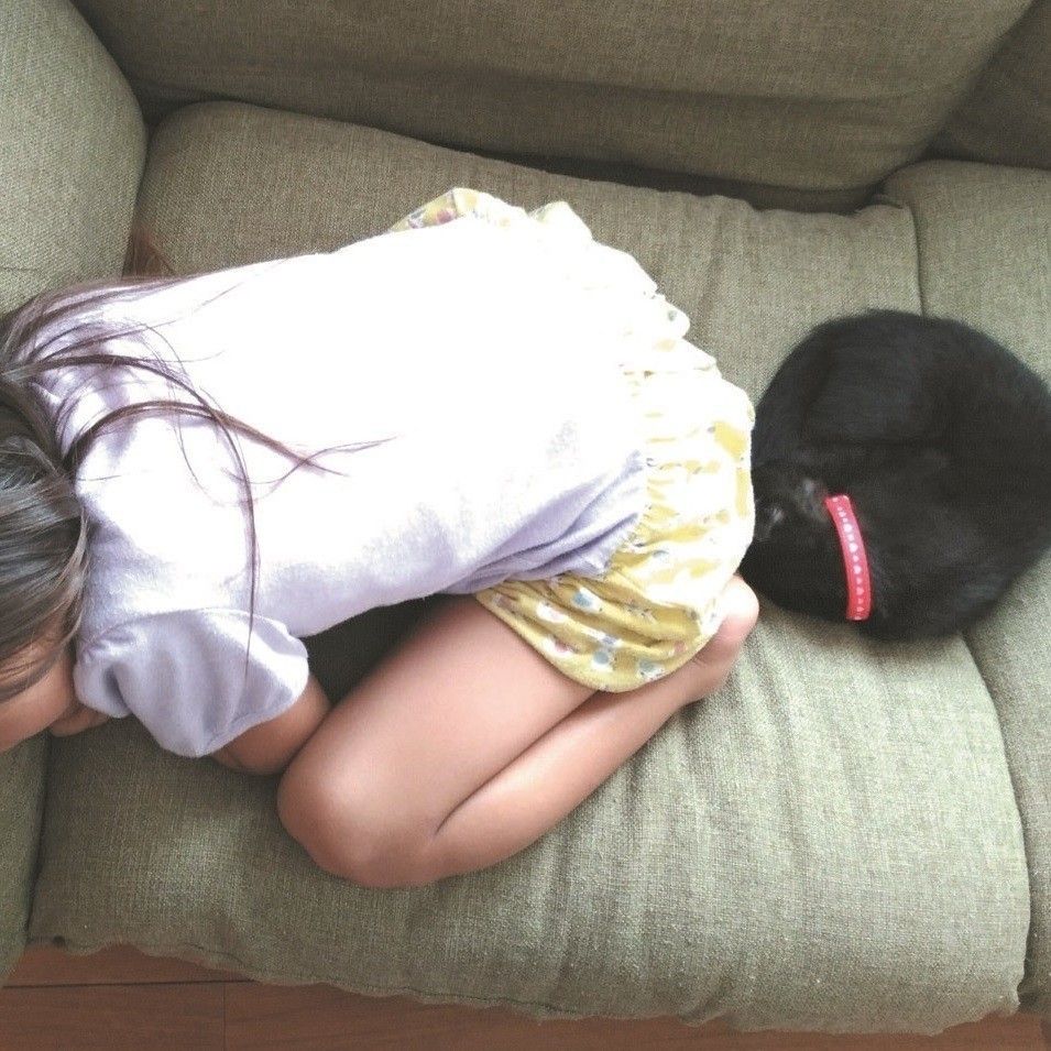 「4カ月齢(当時)の愛猫ジジ(オス)と5才の娘が、ソファの上で丸くなり、仲よくお昼寝していました」とA・Tさん。先生によると、「室温・湿度が同じ環境で寝ていたら、自然と似たポーズをとることが多いでしょう」とのこと。猫は、寒いと熱を逃がさないために丸くなり、熱いと熱を放出するために体を開いて寝ますが、それは人の寝姿にも共通することだそう。「W“アンモニャイト”」がかわいいですね♪