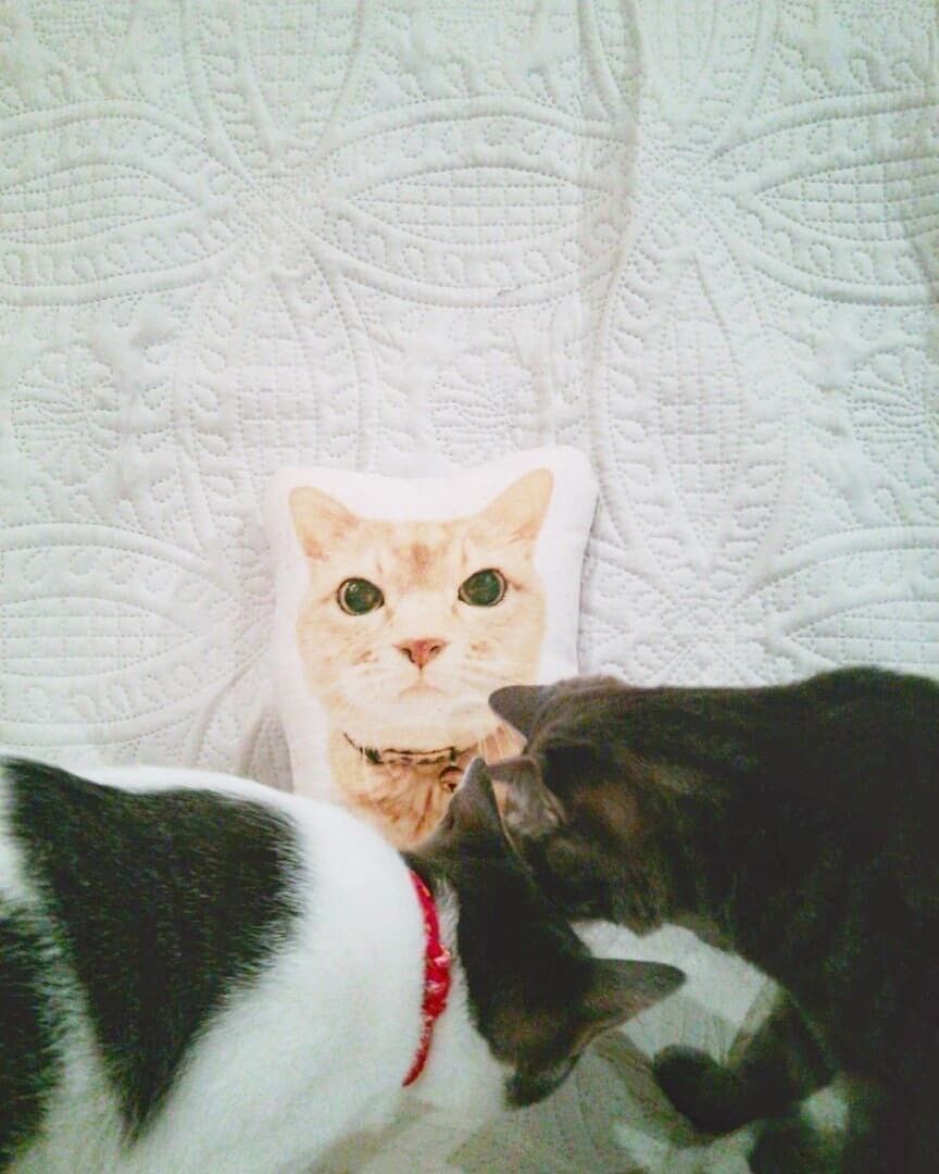 こちらのクッションも天使になった猫のアヤちゃん。あまりにそっくりすぎて、姉弟猫たちも気になる存在のようです。