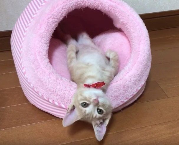 どうしたの?と聞きたくなるほどリラックス子猫。猫ベッドからこんにちは♪