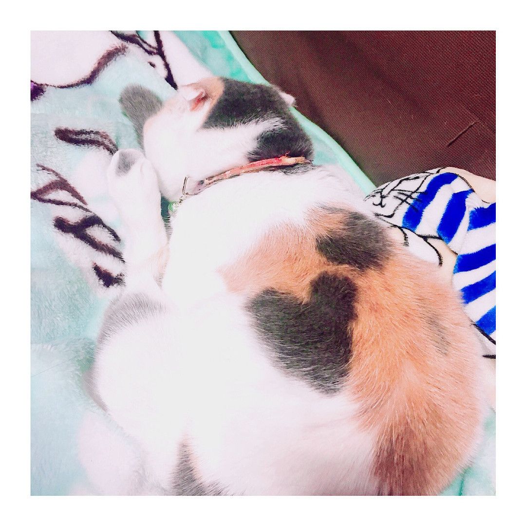 こちらも2匹仲良しのお写真♪寝ているうめちゃんの後ろ姿と一緒に写っているのは、フレンチブルドッグのぽん太くんです。全然違う種類の生き物なのに、柄が似ているとそれだけで兄弟みたいですね!とっても可愛らしいショットです♡