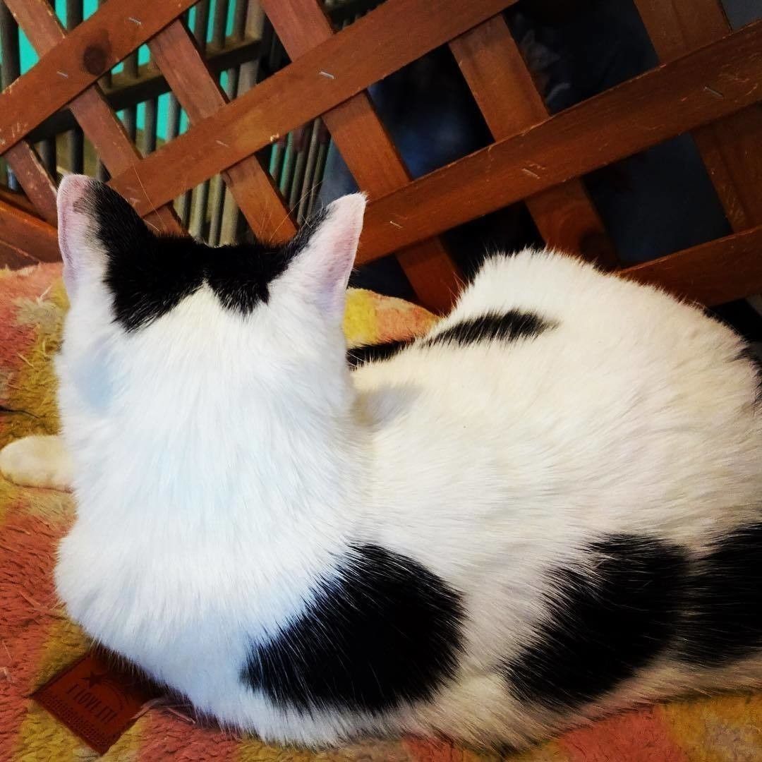 こちらのチャーリーくん、のんびり座っていますね。白と黒のツートンカラーが、まるで牛さんのようです♪保護猫ちゃんとのことですが、素晴らしくきれいでツヤツヤな毛並み!大切に飼われているんでしょうね♡