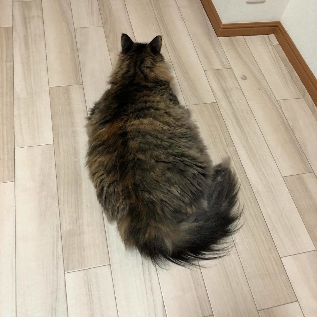 テンちゃんのほうが年齢的には下ですが、画像だとテンちゃんの方が大きいようにも見えますね。この画像の時点で、ハルくんが3.8kg、テンちゃんが3.6kgとのことなので、体重を追い抜くのも時間の問題かも…?じっくり後ろ姿を眺めるからこそわかる、愛猫2匹の大きさの違いですね♪