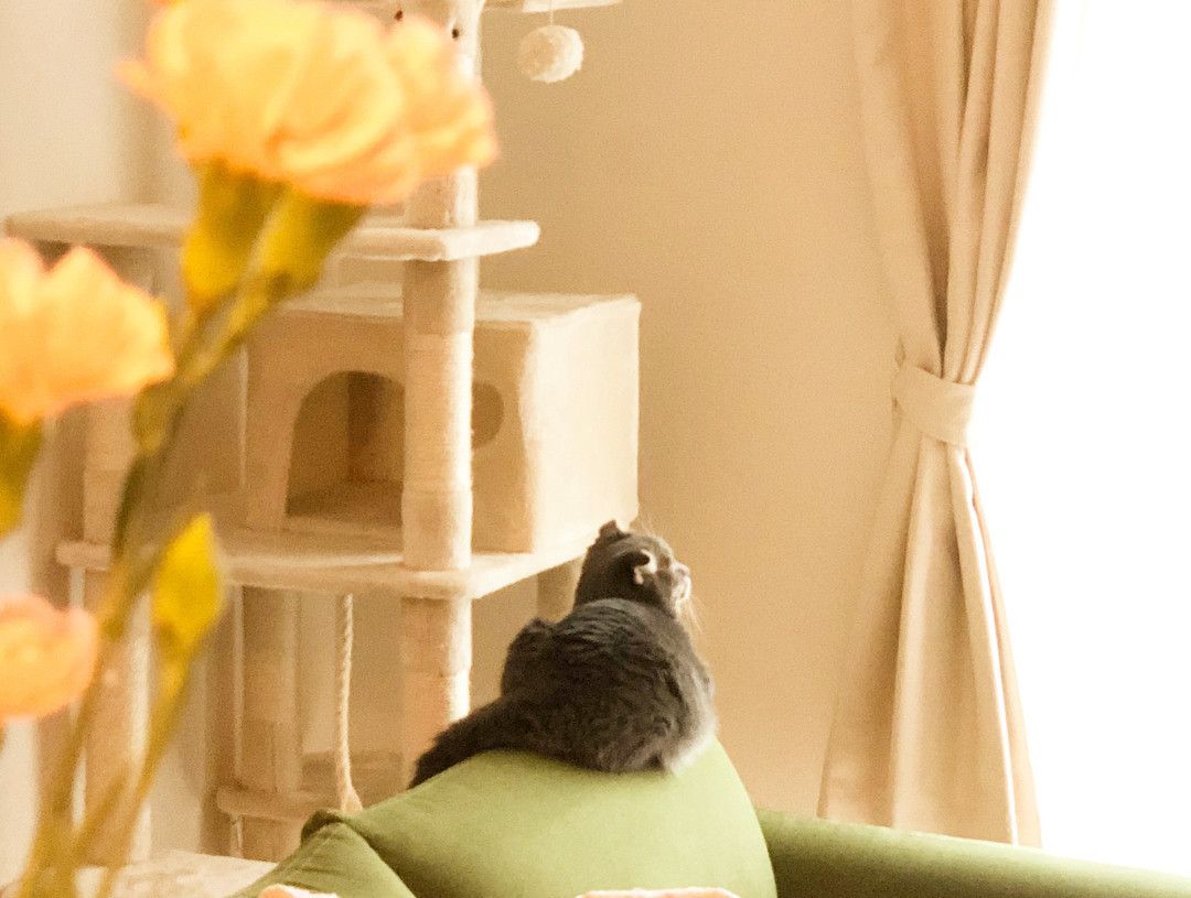 爪とぎタワーの上に座っているのは、マンチカンのミーシャちゃんです♡室内で飼育されている猫は、みんな窓の外が気になるものなのでしょうか…哀愁漂う背中がいい味をだしています。