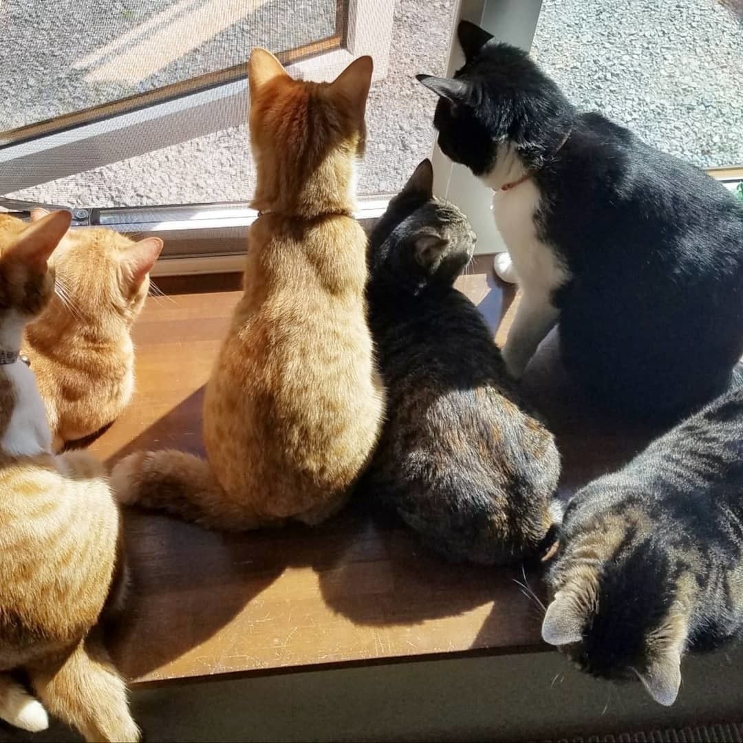 たくさんの猫ちゃんたちのキュートな後ろ姿♡こちらのお宅は、なんと10匹もの猫ちゃんを飼育していらっしゃるそうです!このお写真だけでも、6匹の猫ちゃんがいますね♪