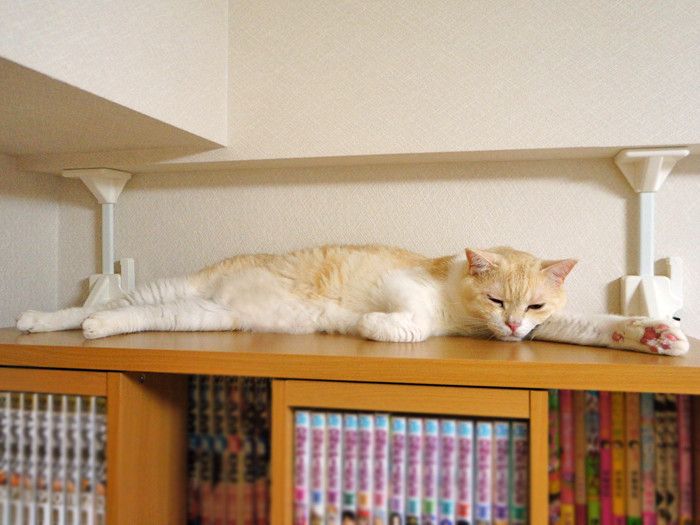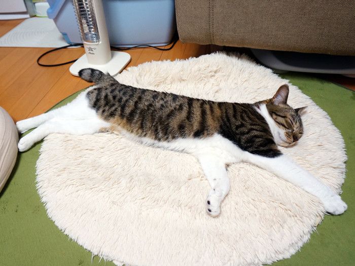 どちらかというと猫はクルッと丸まって寝ているイメージがあると思うので『長い!』といわれてもピンと来ない方も多いかもしれませんが、これがですねぇ~、暑い夏や、暖房器具でとろけているとき、ビックリするぐらい長~~~くなるんですよ、猫って(;^∀^A