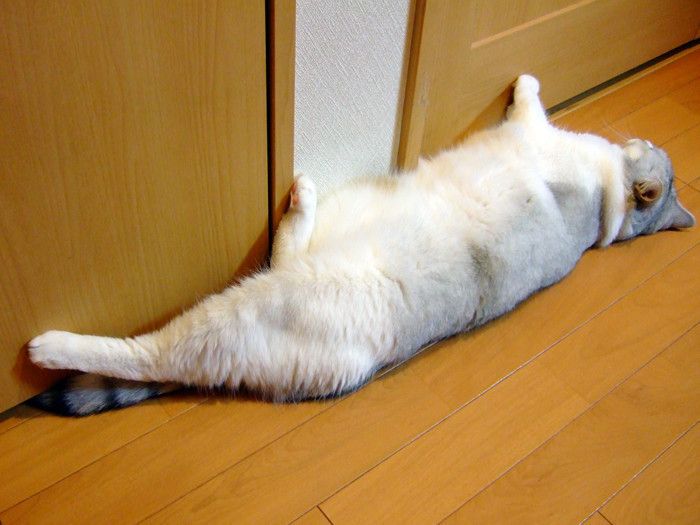 青年期まっ只中だった頃、うには5キロ越え、もーちゃんは6キロ越えの大きな猫だったんです。その大きな猫たちが、胴体をダラ~ンと伸ばし、全力で手足をぐぐーっと伸ばしていると・・・・・それはもう、とてつもない長さになるのですよ!