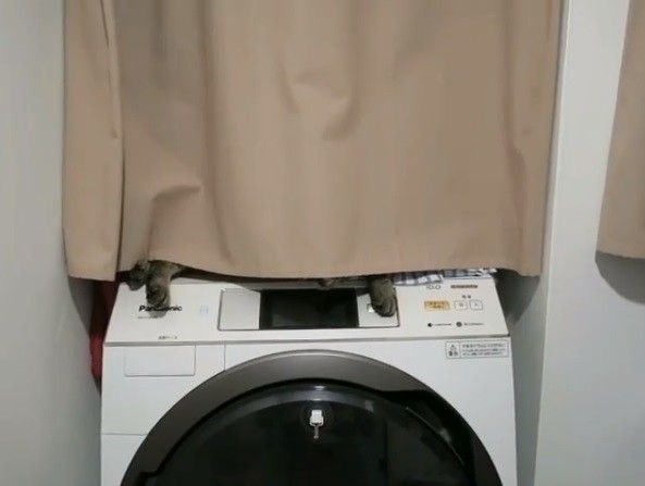 どこにいるかわかるかニャ? 洗濯機の上でまったりくつろぐ猫
