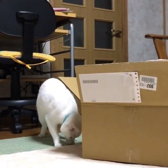 箱をちょっと動かしたときの白猫の見事なジャンプに注目!