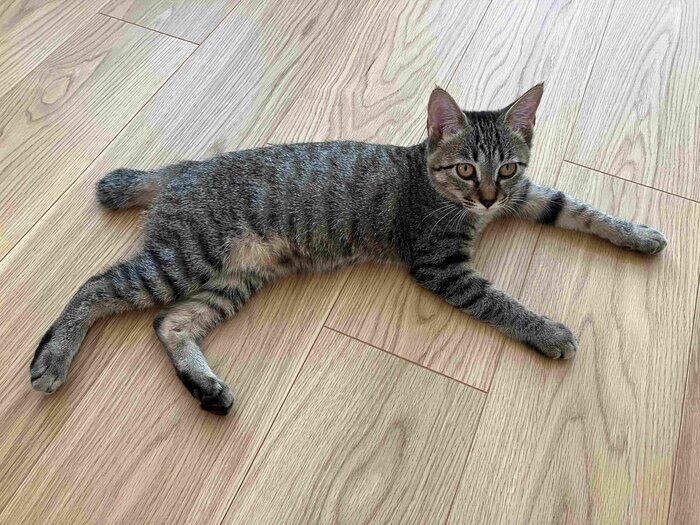 譲渡会で、ケージの中から必死に手を伸ばしていた保護子猫・てんちゃん。家族に迎えられて4カ月、甘えん坊で「たくさん話すコ」へと、すくすく成長しています。