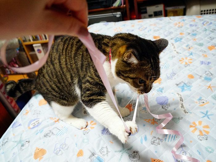 我が家の猫らはですね、猫じゃらしに付いているゴムヒモ、ケーキの箱に巻いてあるリボンのヒモ、はたまた人間が着ているパーカーのフードのヒモなどなど、ヒモ状の物を発見ししだい大喜びでじゃれついてくるぐらい、ヒモが大好きです(・∀・;)