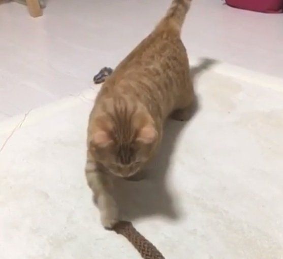 華麗なジャンプに注目! ベルトを生き物だと思って警戒する猫