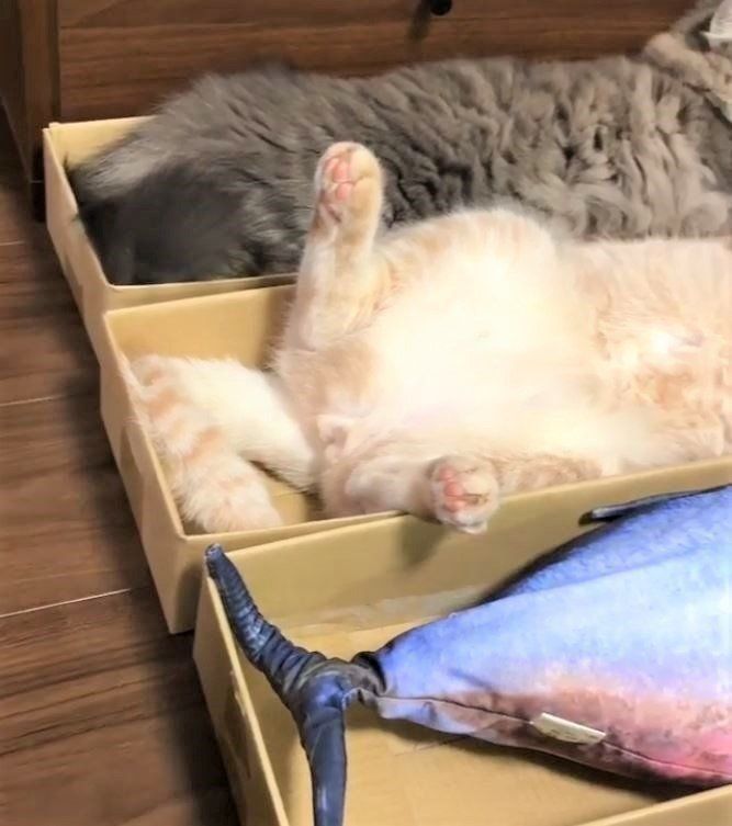 あまりのフリーズっぷりに、まるで魚屋さんの魚かのように擬態してしまうニャンコたち(笑)