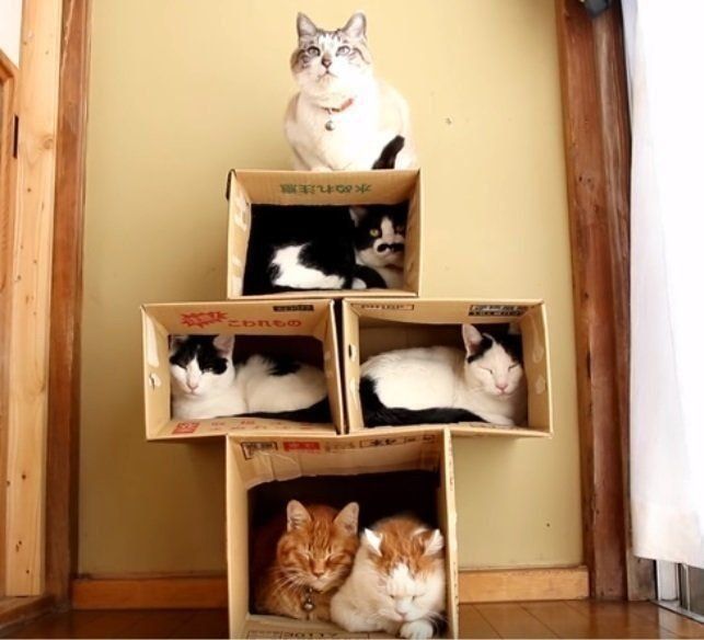 箱でできた猫マンション。絶妙なバランス感覚がすごい!