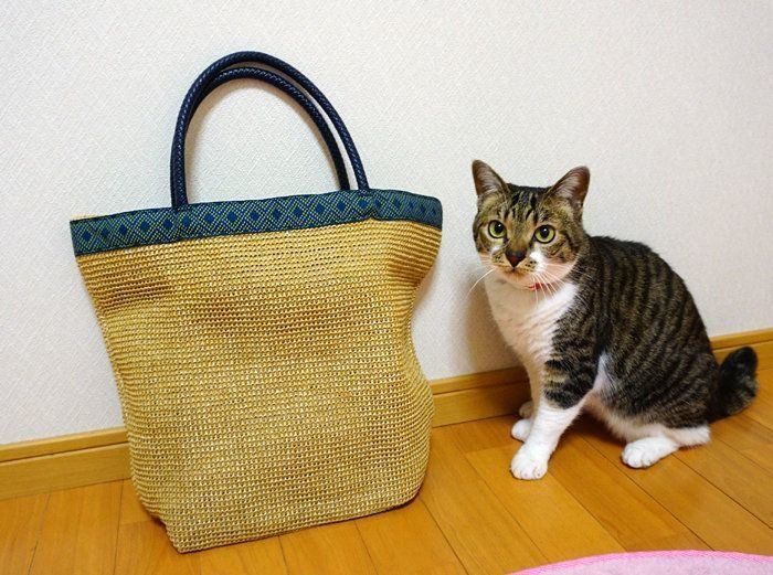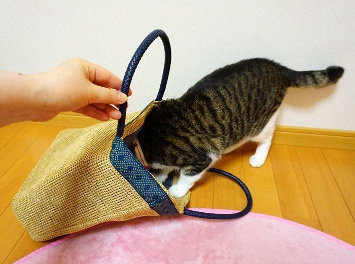 カシャカシャと音の鳴る素材でできておりまして、こうやって猫が入って遊ぶためのバッグなんですねぇ~( ̄∀ ̄)