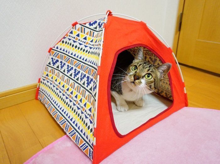 さぁそして最後に紹介しますのは、折りたたんでコンパクトにしまっておくこともできる『キャットテント』!