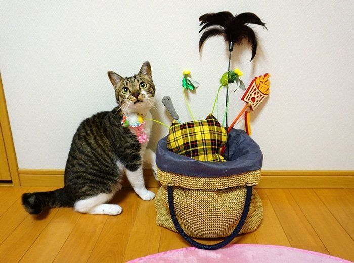 ビビリん坊の猫さんの場合、入ってくれない恐れもありますが、そのまま置いておいても部屋に馴染みそうなデザインなので、こんな感じで猫のおもちゃ入れにしても、いいかもしれませんな♪