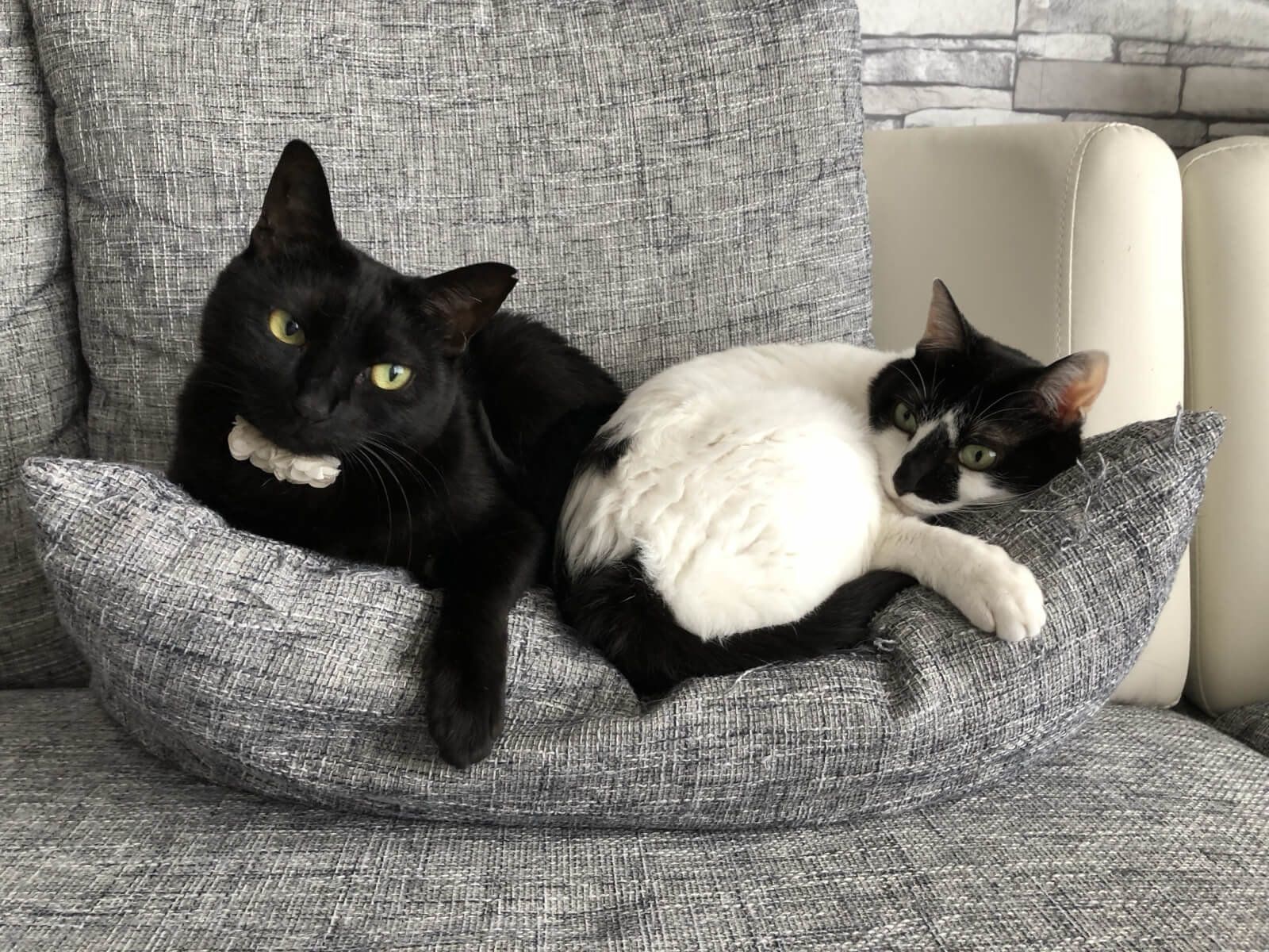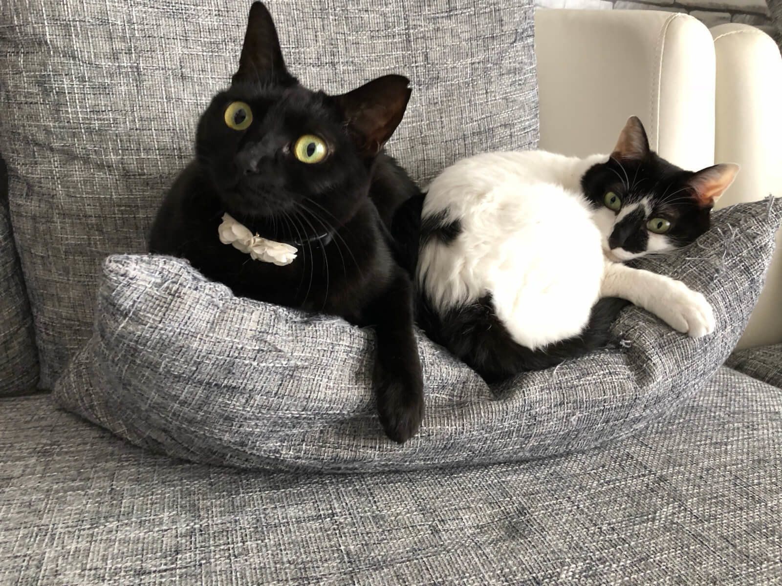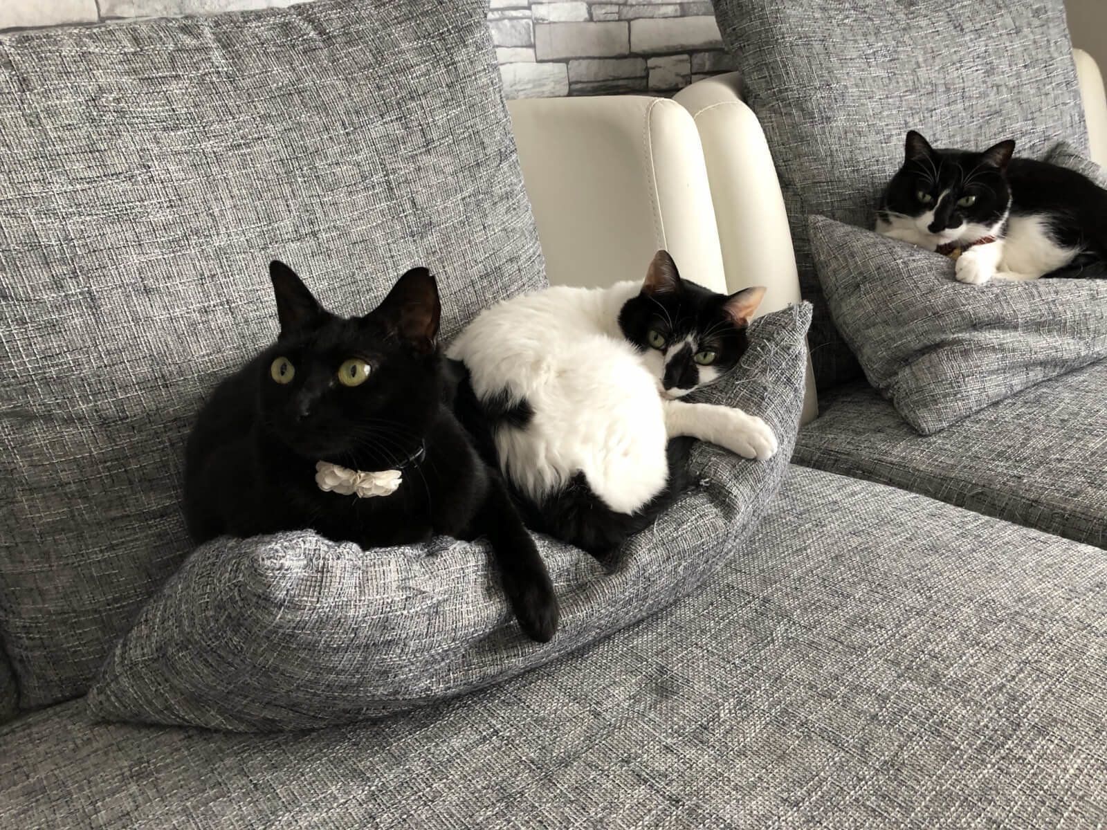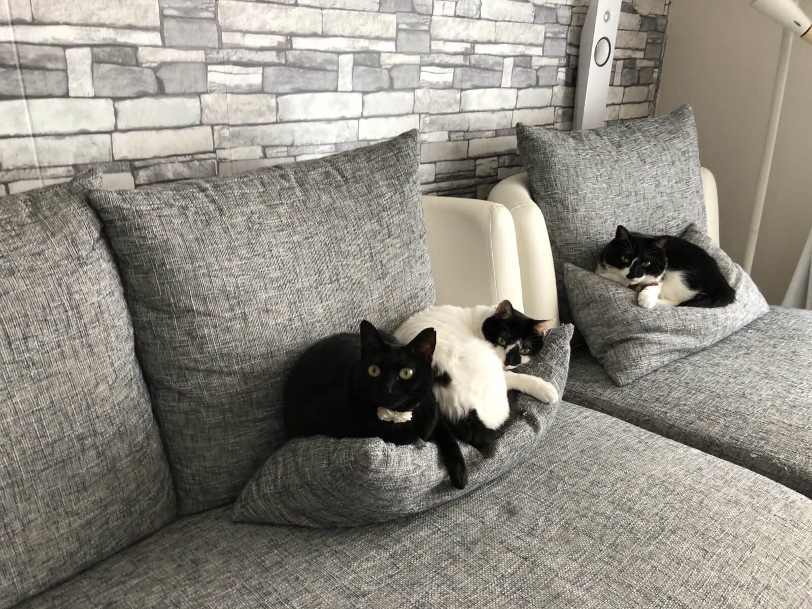 我が家のソファはこうして猫たち専用のベッドだったりカップルシートだったりに都合のいいように変貌して行くのです、ナイスソファ。