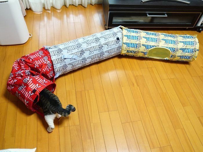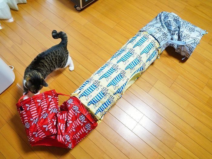 まっすぐ長いトンネルにしてみたり、両サイドを折り曲げてS字にしてみたり、3本ぜんぶ使うと、かなり大掛かりな猫用アスレチックになりますよ(・∀・)b