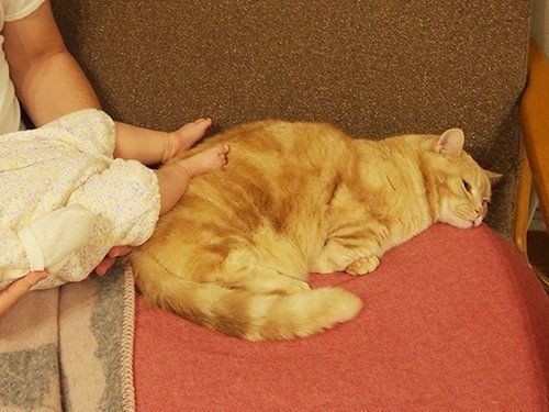 またある時は香箱座りで妹の頭の上にちょこん。