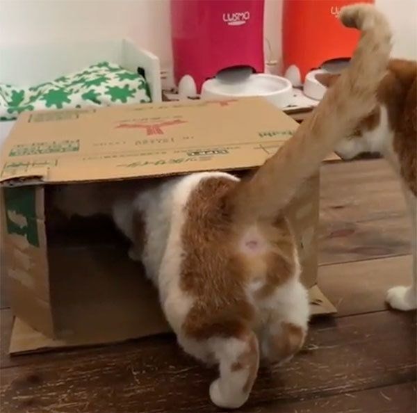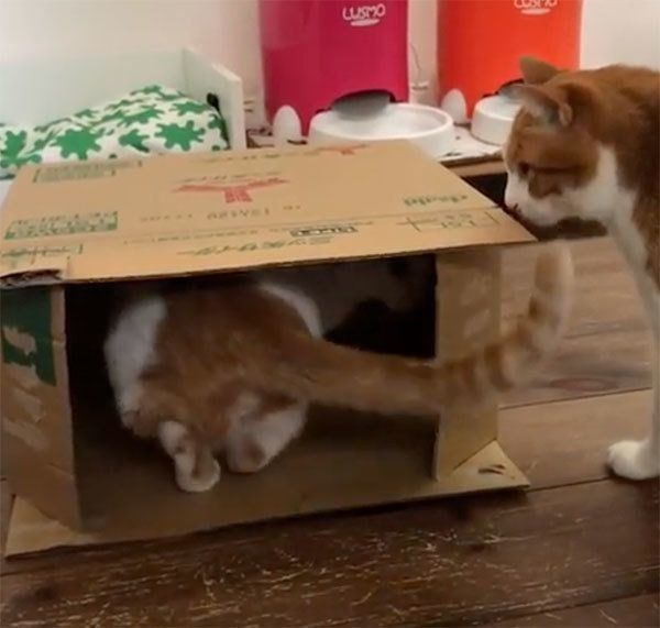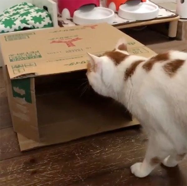 迷うことなく、あっという間にダンボールの中へと入っていったタルトくん。「猫ホイホイ」の誘惑には勝てなかったようですね(*´∀`*)