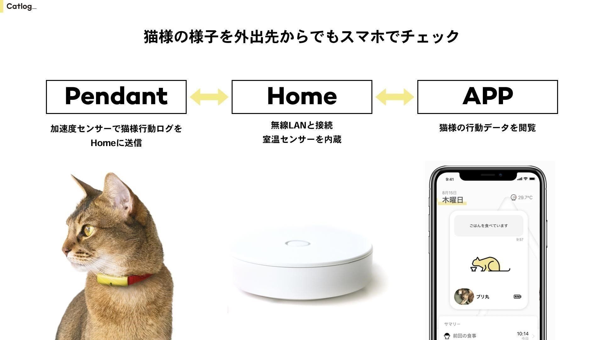 Pendantに内蔵された加速度センサーで猫様の行動ログを取得、Homeは無線LANと接続し、Pendantからのデータを受け取りサーバーへ転送。飼い主さんは、スマホアプリで猫様の行動を見ることができます。