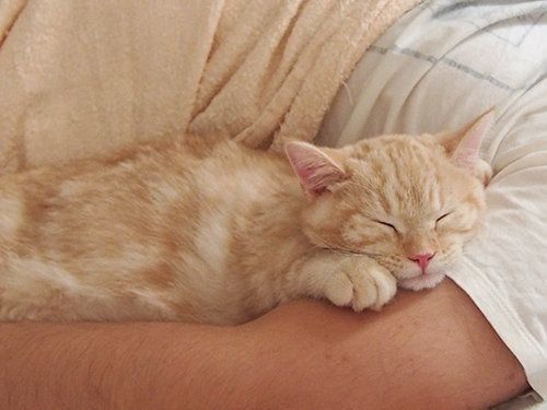 「おいで」って手を伸ばすと「にゃーん」と飛び乗ってきます。