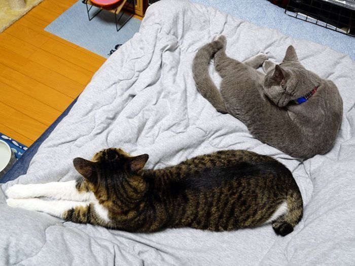 もはや寝ていられないので致し方なく起きると、『あ、ママ起きたんだ( ̄∀ ̄)』と、ワタクシが起きたことを確認し、今度は猫たちがスヤスヤ眠るという・・・・