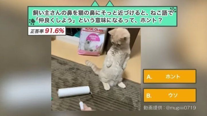 小鳥遊さんは、人間がねこに「仲良くしよう」というサインを送るには、鼻チューではなく、人間側がげんこつを作ってねこの鼻の前に差し出さなければならない…という情報をなにかで見たから「ウソ」を選んだそうなんです。