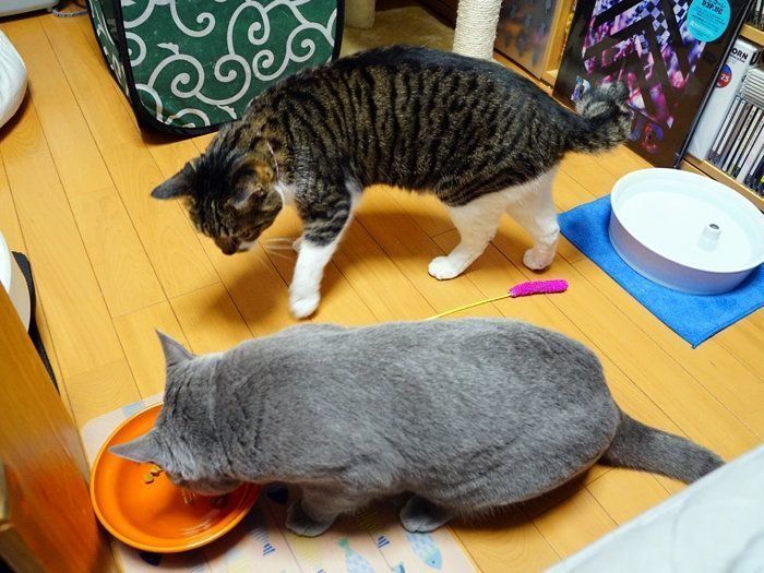 あれは夜、ムームーが自分のゴハンを食べていたときのことです。ふらりとやって来たてんちゃんが、『さぁ、てんちゃんもいただきましょ♪(* ̄∀ ̄*)』とムームーの横にスッと並び、ピッタリと体をくっ付け、ひとつのお皿から一緒にゴハンを食べはじめたのです!