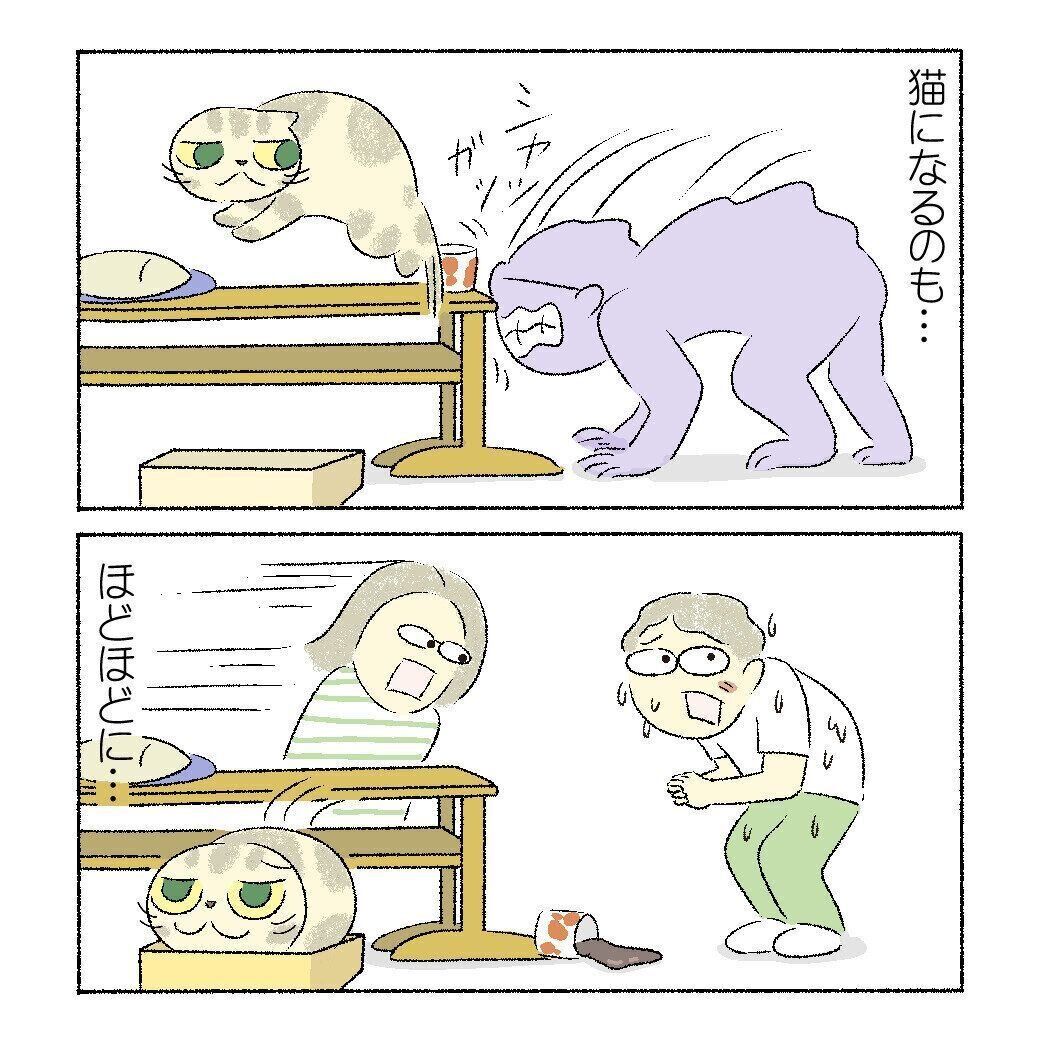 - ししまるがテーブルに登った瞬間に猫の声を真似て「シャッ」と言う
