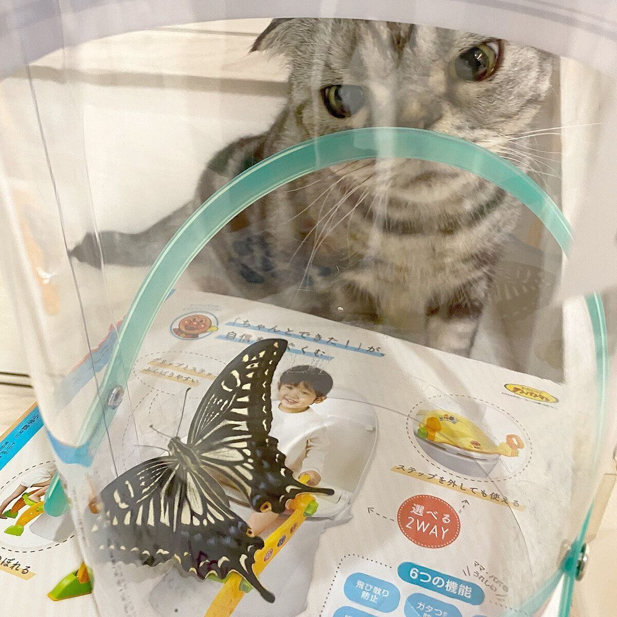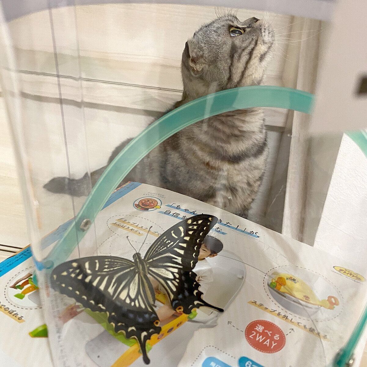 入れ物に蝶がいることに気がつかないししまるは、キョロキョロしつつ、細く短い声で「ニャッニャッニャッ」と3回ほど鳴きました。