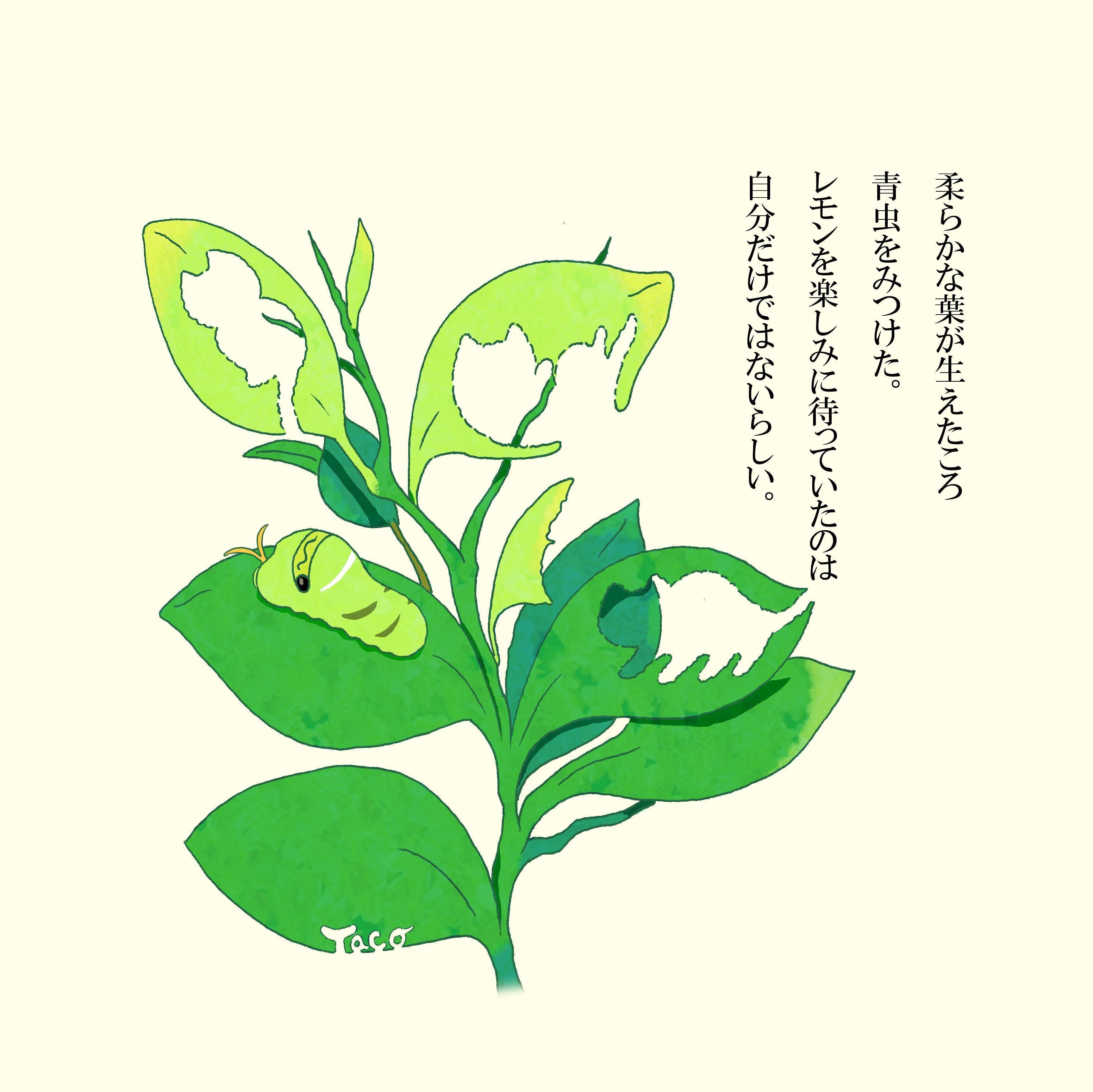 よく見ると、アゲハチョウの幼虫が「パリパリ」と音を立てながら、レモンの香りがする柔らかそうな葉を食べていたのでした。