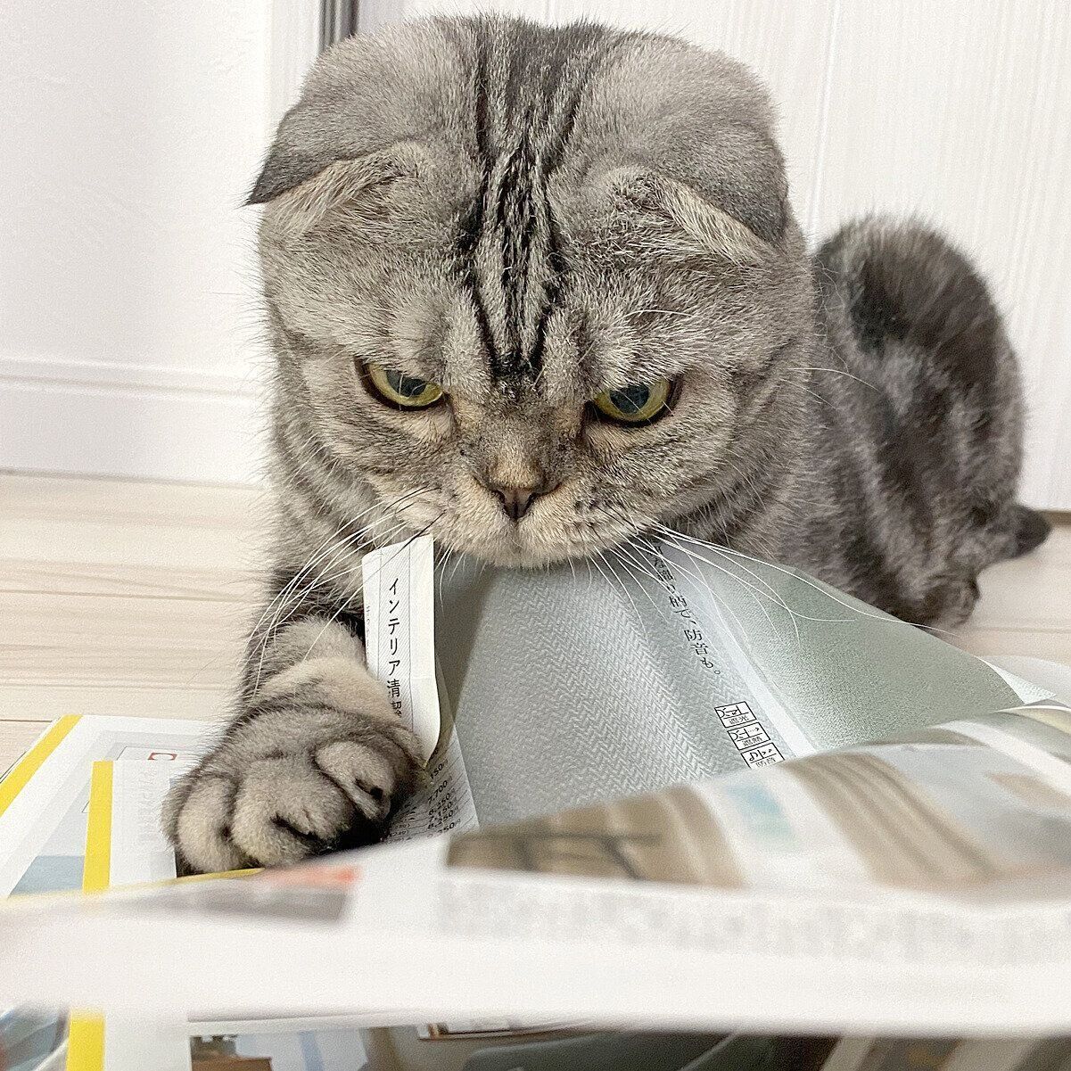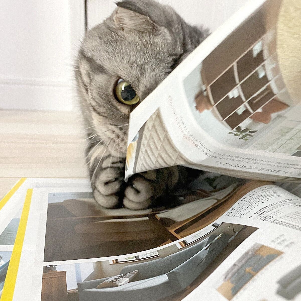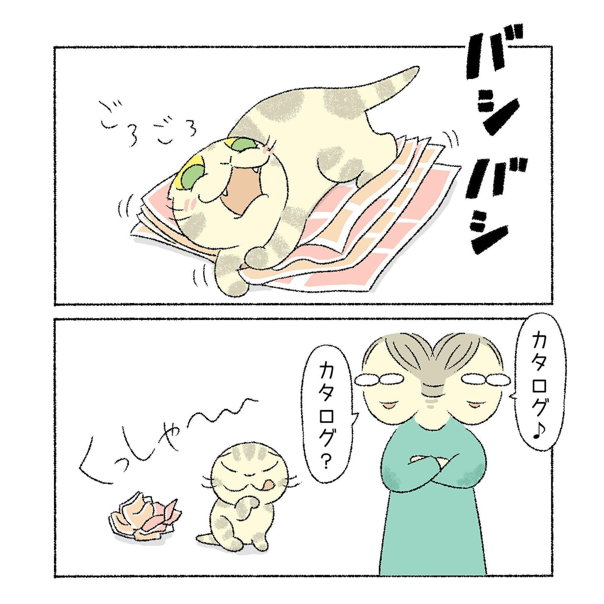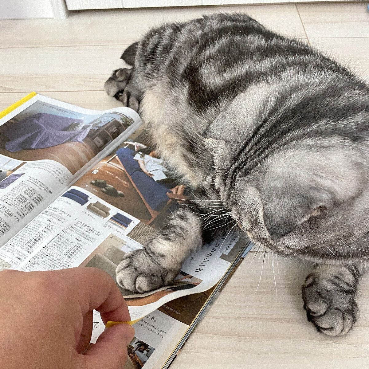 そして、ししまるもカタログが好きなようで、カタログを見ている音を聞くと、寝ていた体を起こしてのびーっとし、のそのそと近寄ってきます。
