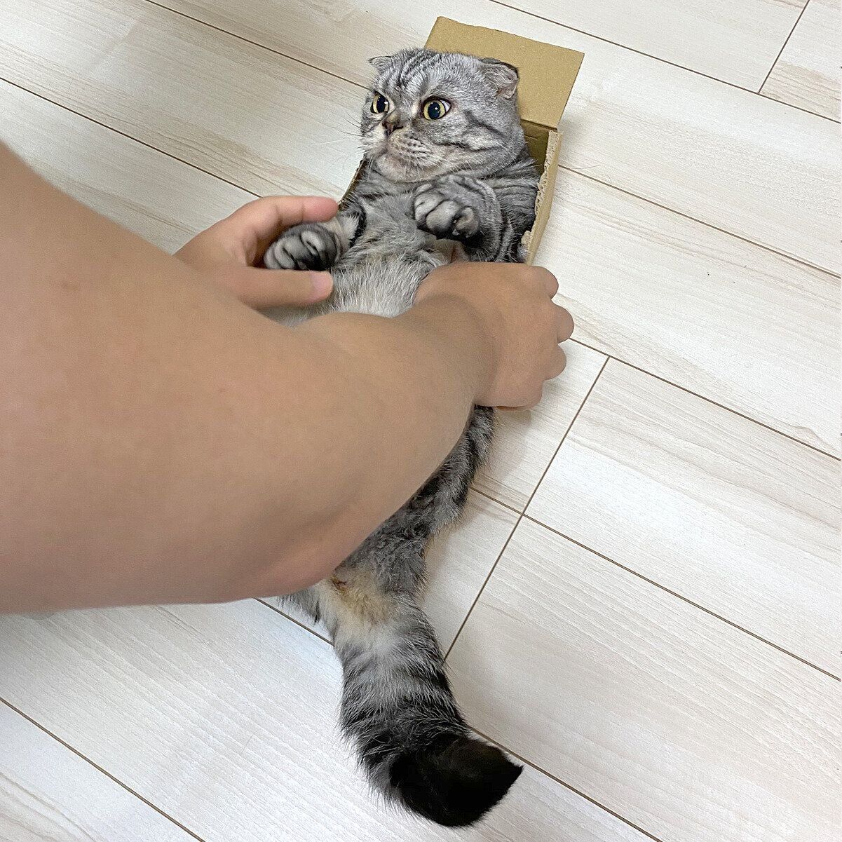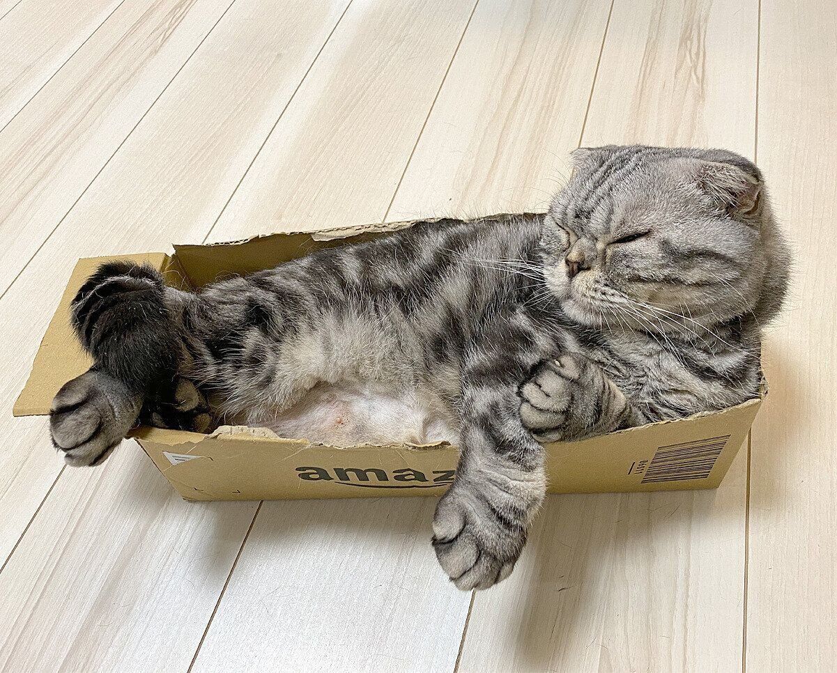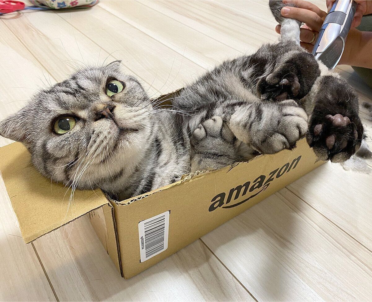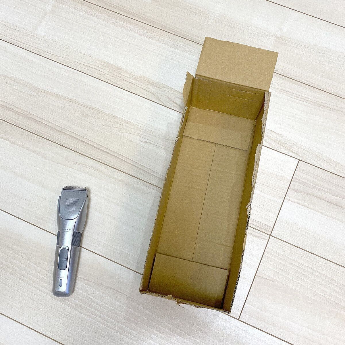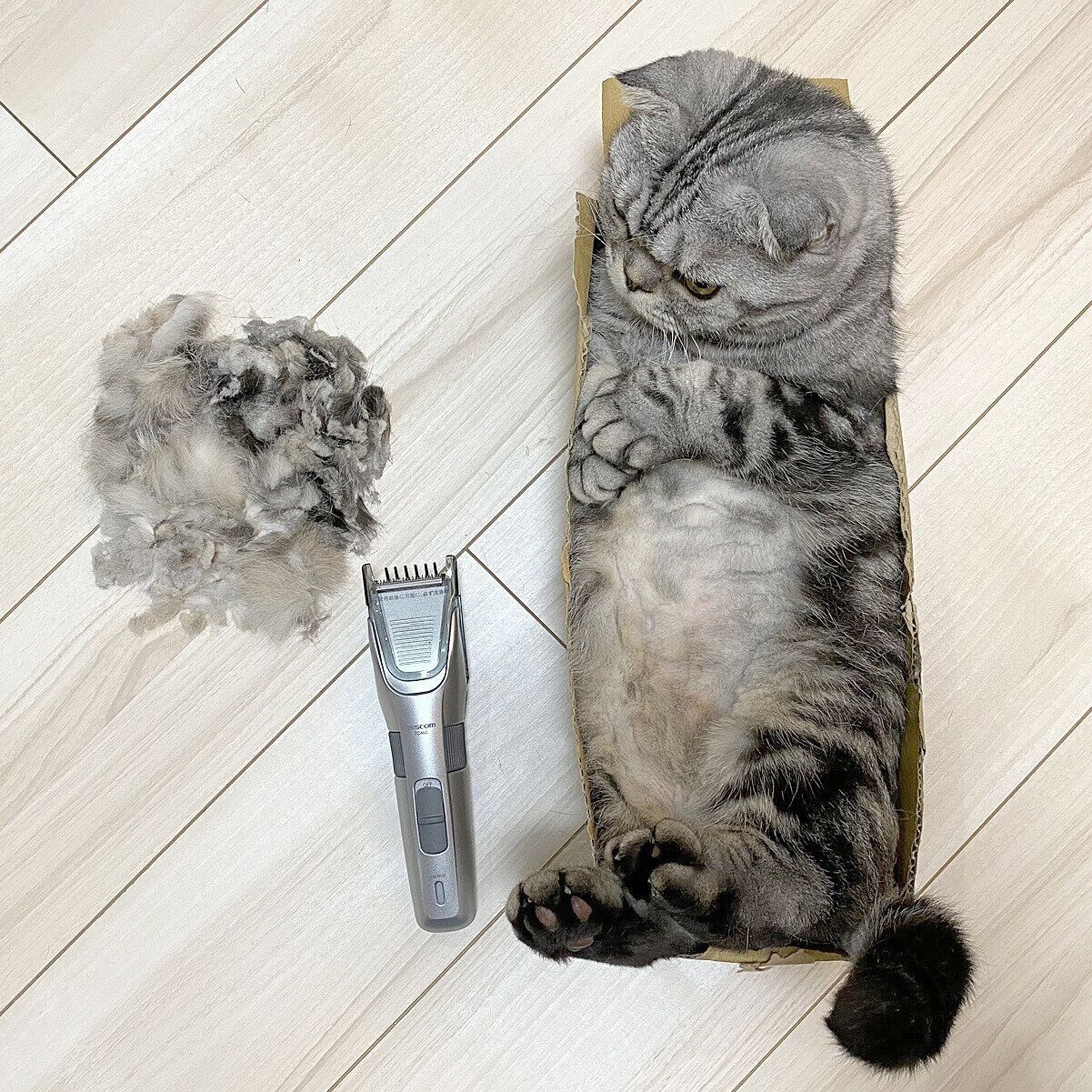 箱ソムリエのししまるは、この細長い箱が気に入ったようで、バリカン中は終始リラックス。